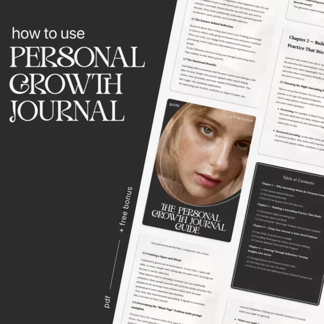 Discover how to turn everyday thoughts into lasting transformation with The Personal Growth Journal Guide — a beautifully structured digital guide designed to help you explore who you are, where you’re headed, and how to get there. Whether you’re new to journaling or ready to take your self-reflection deeper, this guide walks you through how to use journaling for personal growth in an intentional, sustainable way. With step-by-step prompts, examples, and a sprinkle of AI-enhanced insights, you’ll learn to reflect with purpose and grow with clarity.